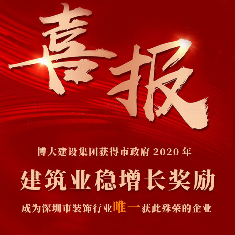 博大建設集團榮獲深圳市政府2020年建筑業(yè)穩(wěn)增長獎勵,博大是獲此殊榮的唯一一家裝飾企業(yè),當之無愧成為深圳市的行業(yè)龍頭,為行業(yè)爭光。