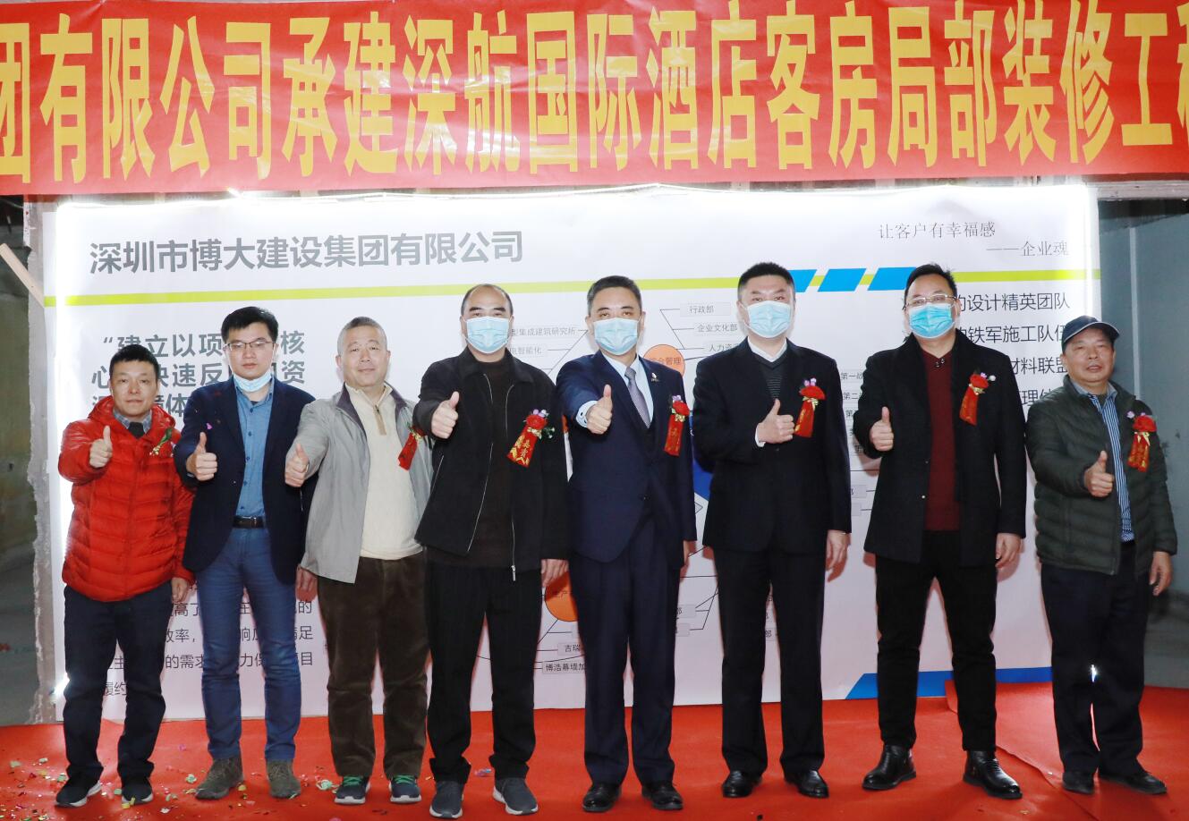 2021年1月14日,在開完深航國際酒店客房局部裝修工程第一次工地會議后,集團(tuán)副董事長黃河、第三戰(zhàn)區(qū)總經(jīng)理徐朝華與深航基建處副總經(jīng)理陳新、深航基建處工程管理中心譚波、深航酒店副總經(jīng)理肖強(qiáng)、深圳市中安項(xiàng)目管理有限公司總經(jīng)理趙坤強(qiáng)等一行領(lǐng)導(dǎo)參加了深航國際酒店開工典禮剪彩儀式。