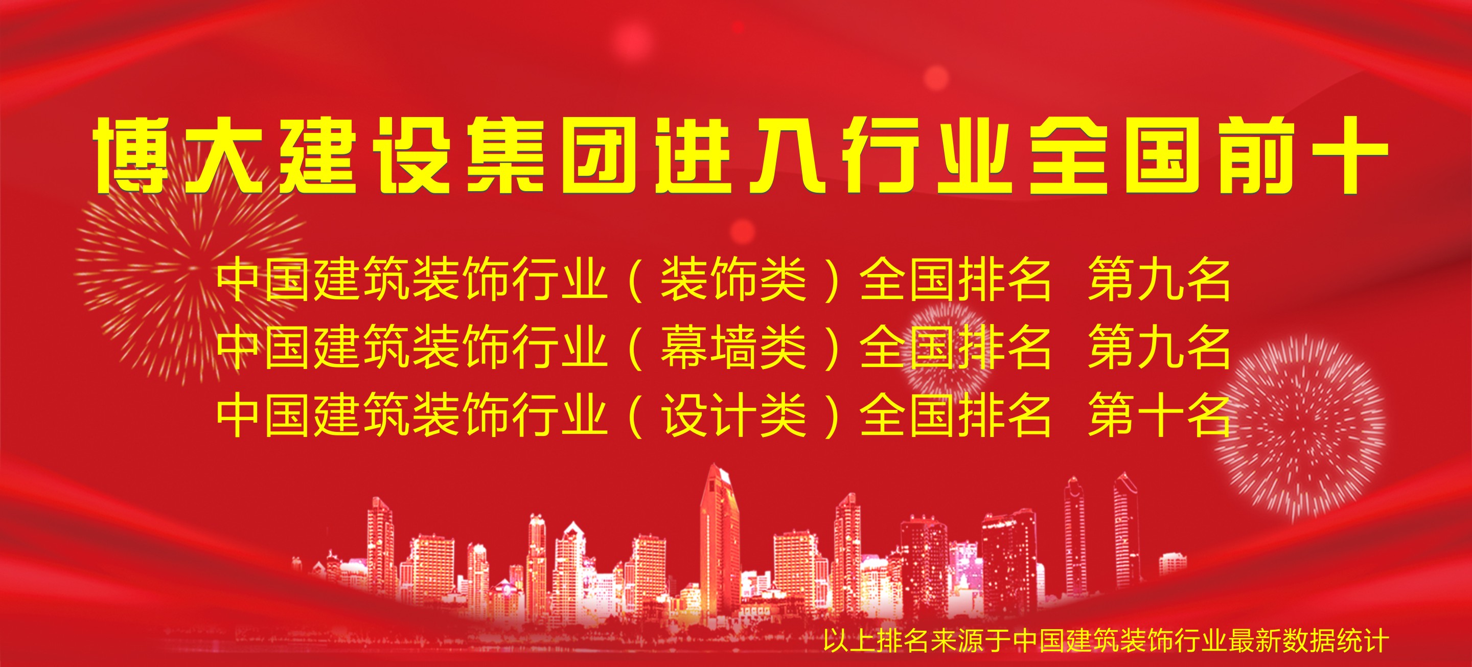 2019年1月9日,中國建筑工程裝飾頒獎大會在北京隆重舉行,根據(jù)中國建筑裝飾行業(yè)綜合數(shù)據(jù)統(tǒng)計,博大建設(shè)集團憑借綜合實力,以奮進姿態(tài)挺進行業(yè)全國前十,其中,裝飾類排名全國第九、幕墻類排名全國第九、設(shè)計類排名全國第十。