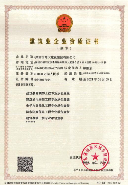 繼獲得展覽工程企業(yè)壹級、展覽陳列工程設(shè)計與施工一體化壹級、潔凈工程壹級資質(zhì)之后,這是博大半年內(nèi)獲得的又一個壹級資質(zhì)。夢想有多高,收獲就有多大,博大平臺資質(zhì)建設(shè)速度前所未有。