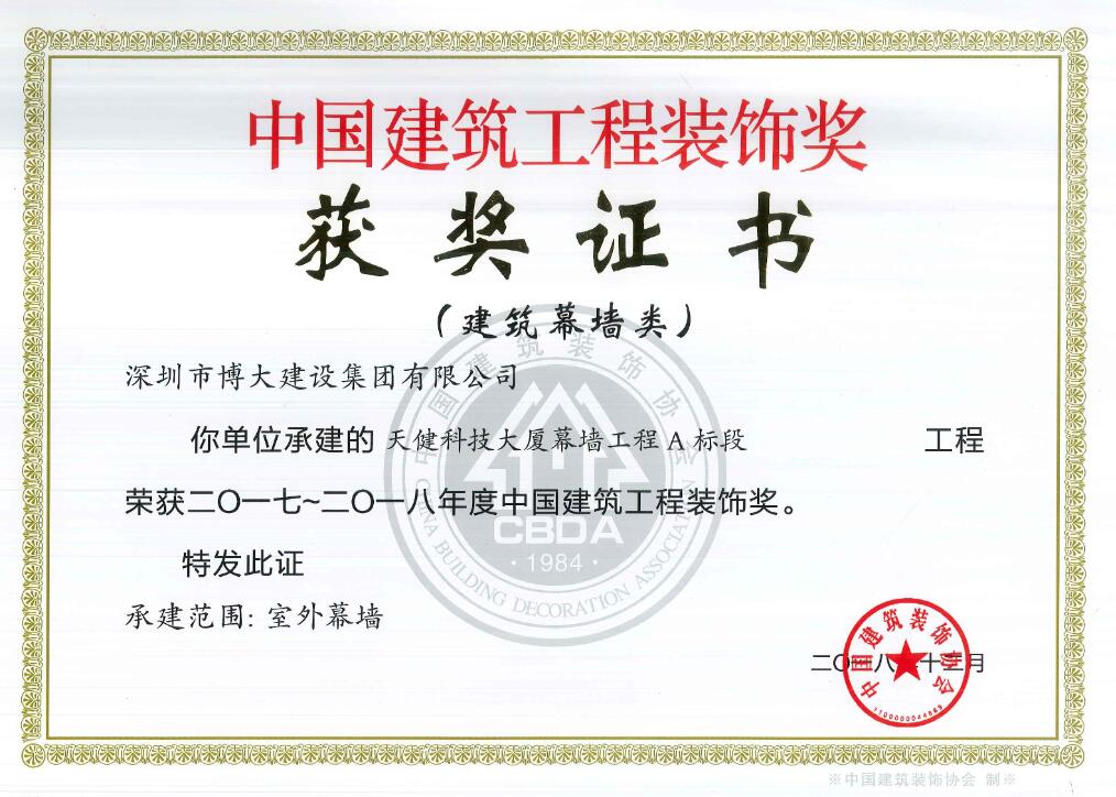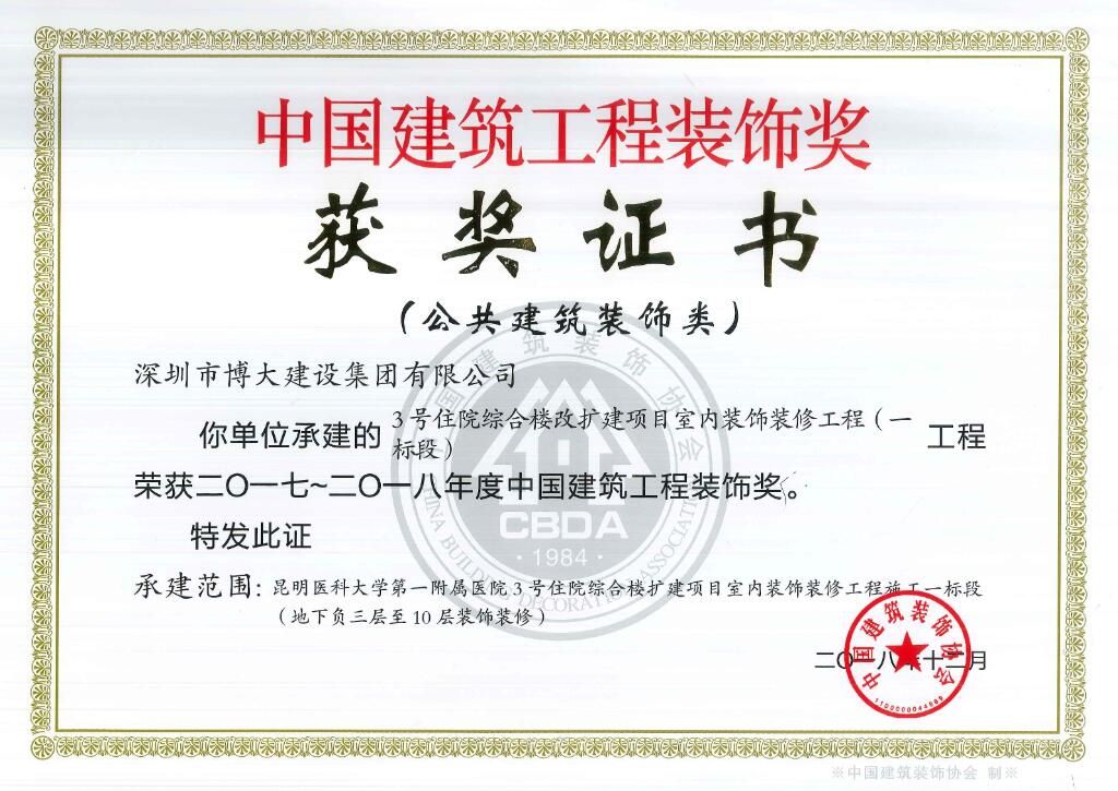 博大建設(shè)集團(tuán)承建的昆明醫(yī)科大學(xué)第一附屬醫(yī)院3號(hào)樓、華遠(yuǎn)金外灘四期君悅酒店、綠景虹灣裙樓商業(yè)公共部分、水貝金座大廈幕墻工程、天健科技大廈幕墻工程等5個(gè)經(jīng)典工程以卓越品質(zhì)榮獲中國(guó)建筑工程裝飾獎(jiǎng)。