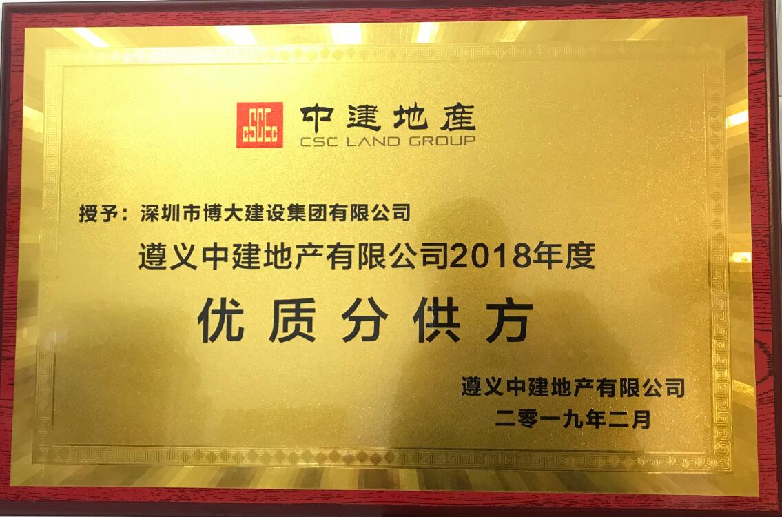 博大建設(shè)集團秉承“讓顧客有幸福感”的企業(yè)魂,與遵義中建地產(chǎn)建立起良好的戰(zhàn)略合作關(guān)系,保安全、保質(zhì)量、保工期、保服務(wù)、守合同,以優(yōu)秀成果獲得客戶的高度認(rèn)可,榮獲遵義中建地產(chǎn)2018年度“優(yōu)質(zhì)分供方”。
