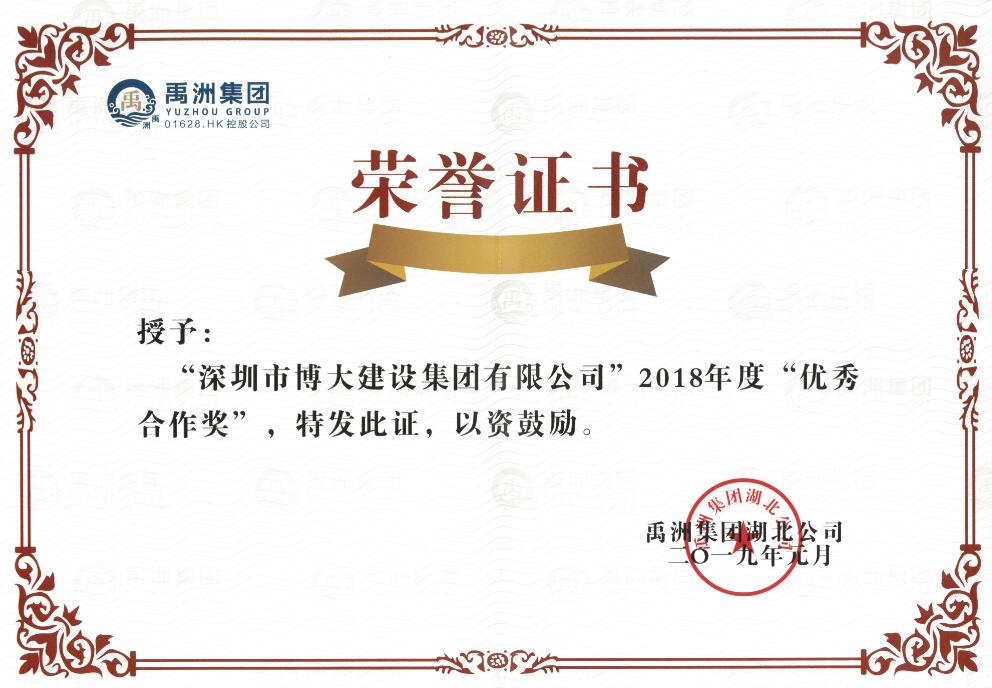 博大建設(shè)集團承建了禹洲集團湖北公司武漢賽洛城六期的精裝房工程,在武漢百盤維權(quán)的背景下,博大負(fù)責(zé)的精裝房一次性交房率達到98.41%,且工程質(zhì)量優(yōu)秀,幫助客戶成功避免了因交期、裝修質(zhì)量而造成的消費者維權(quán)風(fēng)波。博大的綜合實力和用心服務(wù)贏得禹洲集團湖北公司的高度認(rèn)可,榮獲2018年度優(yōu)秀合作獎。