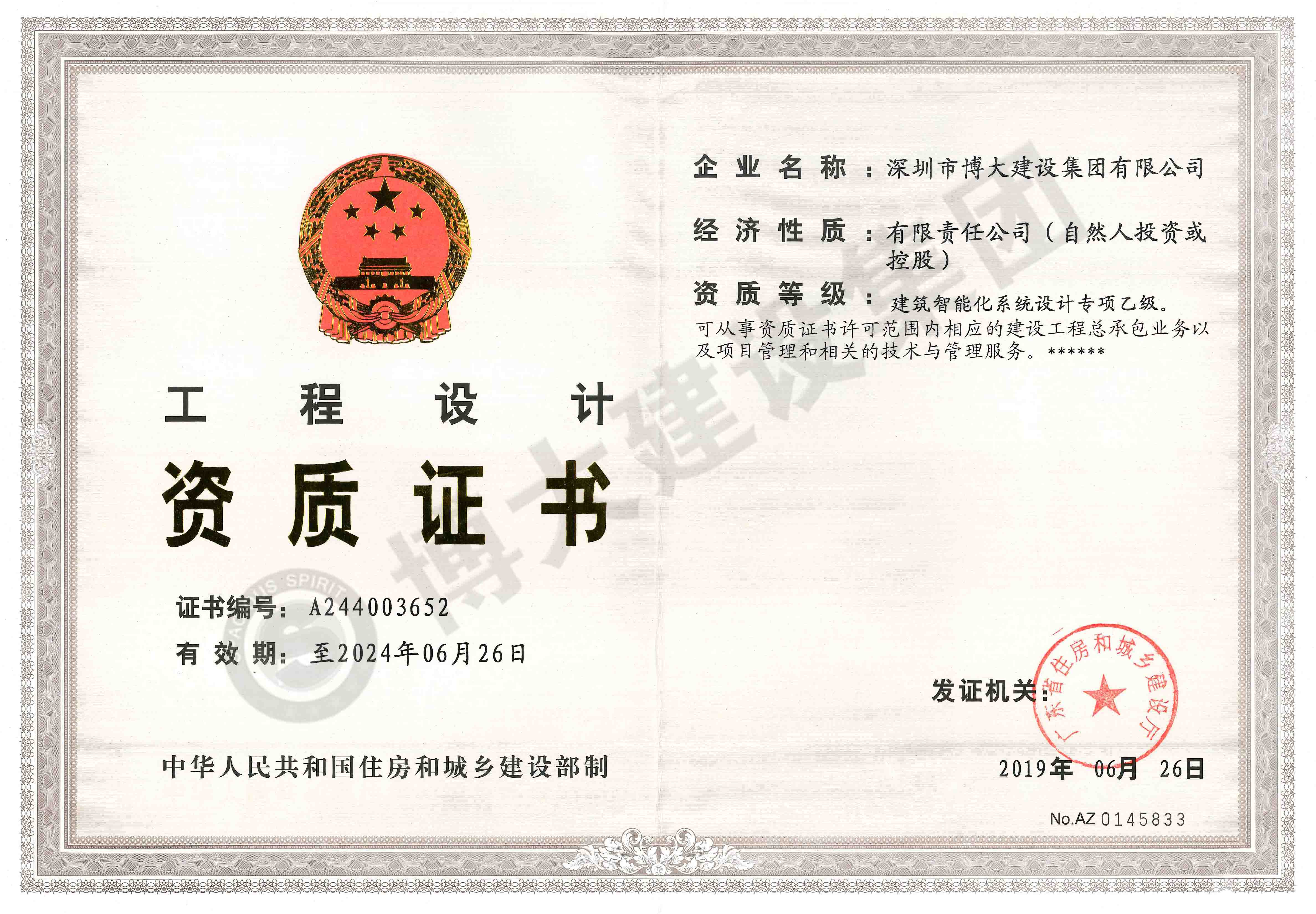 博大資質(zhì) | 喜獲建筑智能化系統(tǒng)設(shè)計(jì)專項(xiàng)乙級(jí)