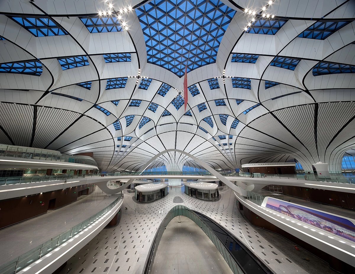 北京大興機(jī)場(chǎng)航站樓建設(shè)面積達(dá)140萬(wàn)平方米,是世界上規(guī)模最大的單體航站樓。首次采用“放射”狀五指廊構(gòu)型。中心點(diǎn)到最遠(yuǎn)端是600米,走路最多8分鐘就能登機(jī)。
