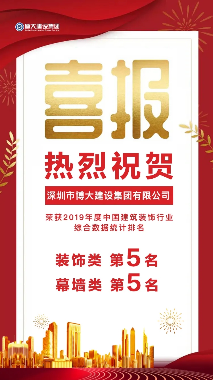 2020年12月23日上午,2019年度中國建筑裝飾行業(yè)綜合數(shù)據(jù)統(tǒng)計排名發(fā)布會在深圳市隆重舉行,深圳市博大建設(shè)集團(tuán)有限公司憑借綜合實(shí)力在裝飾類和幕墻類同步躍居全國第五名!