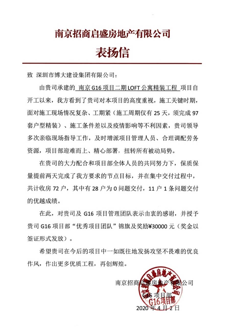 博大建設(shè)集團(tuán)在南京G16項目二期LOFT公寓精裝工程中,迎難而上,積極解決工期問題,以高標(biāo)準(zhǔn)的質(zhì)量,提前完成節(jié)點目標(biāo),受到客戶的表揚,并榮獲“優(yōu)秀項目團(tuán)隊”榮譽。