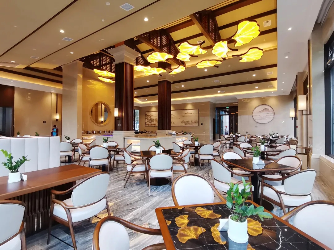 通透的全日制早餐廳,為客人帶來愜意的用餐時(shí)光。捫布硬包質(zhì)感素雅,晶瑩剔透的大理石地面及布菲臺(tái),打造此現(xiàn)代明快的用餐空間。
